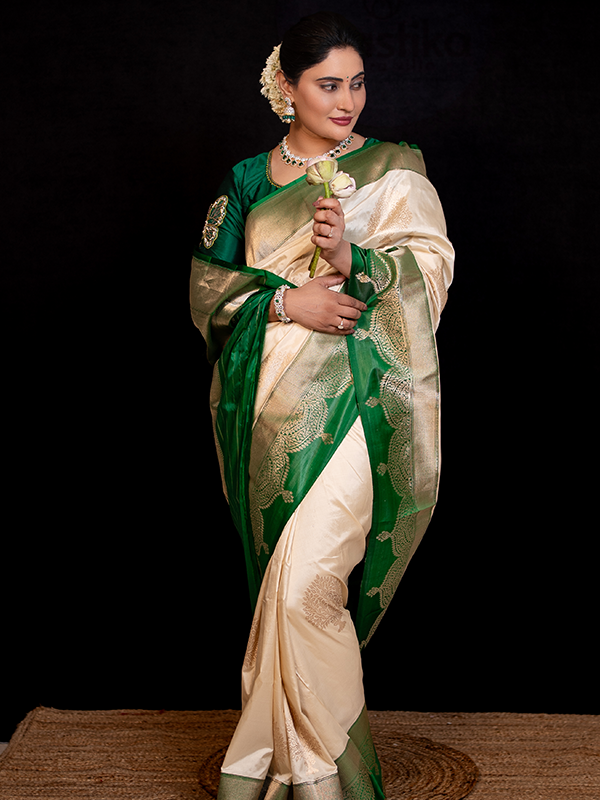 Celebrate timeless tradition with this Katan Raw Mango Saree, handwoven from pure Katan silk. Featuring elegant raw mango motifs and a lustrous finish, this saree blends classic artistry with royal sophistication.