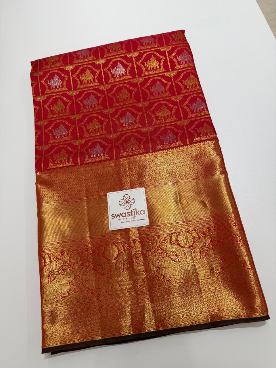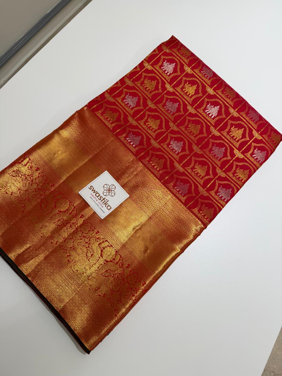 Be the first to review “Double Zari Weaving Pure Kanchi MeenaKari – (Classic green and red silk saree with gold zari motifs.)” Cancel reply