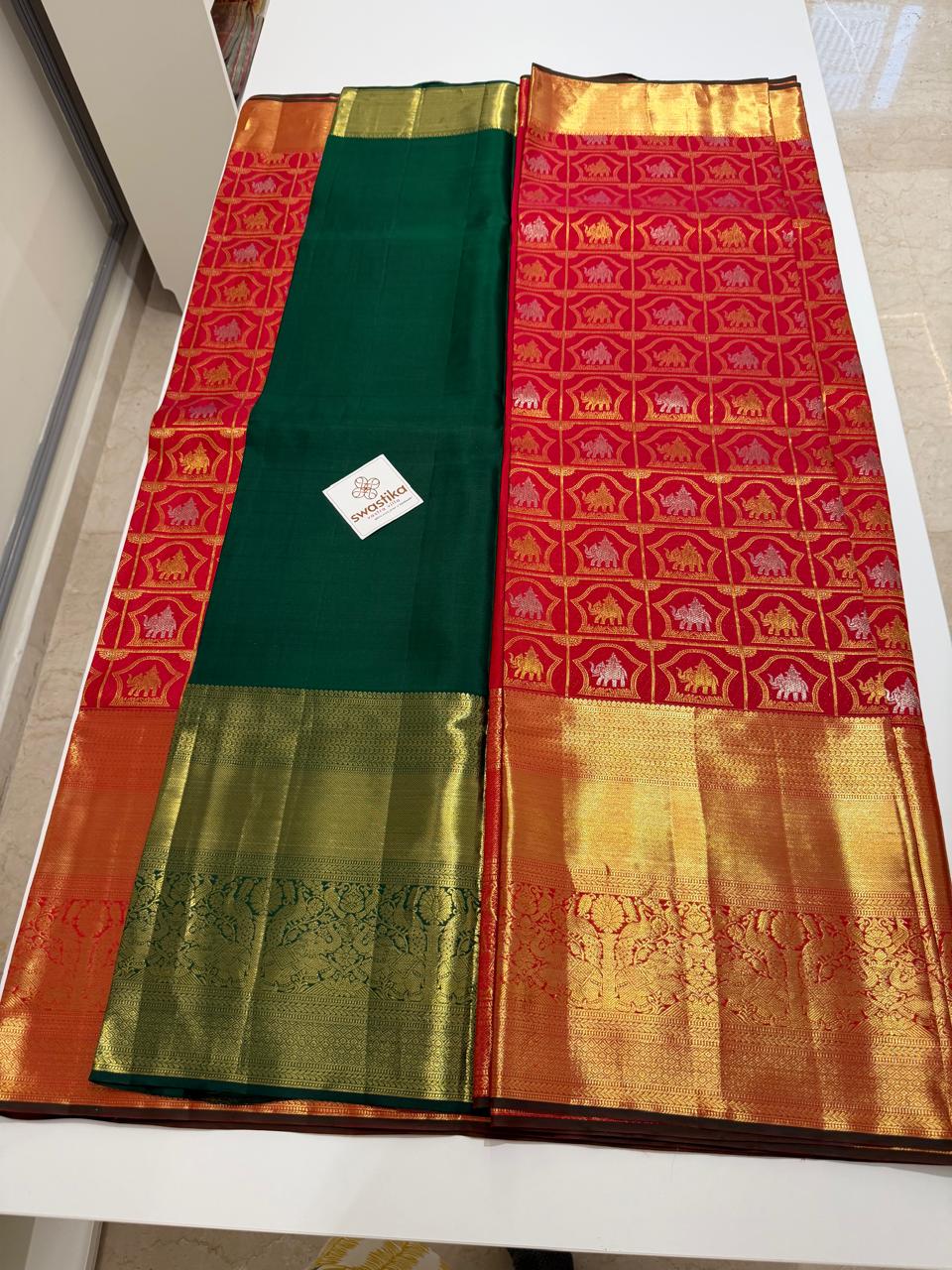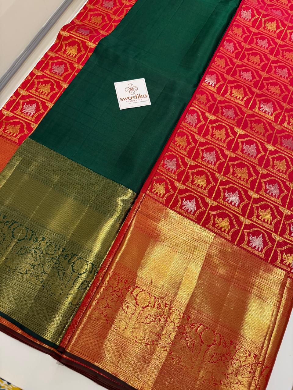 Double Zari Weaving Pure Kanchi MeenaKari – (Classic green and red silk saree with gold zari motifs.)