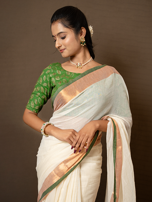 The saree’s ivory hue exudes purity and sophistication, while the double zari border adds a regal touch of festivity. The soft shimmer of zari complements the natural texture of mulcotton, creating a harmonious balance between understated elegance and festive allure.