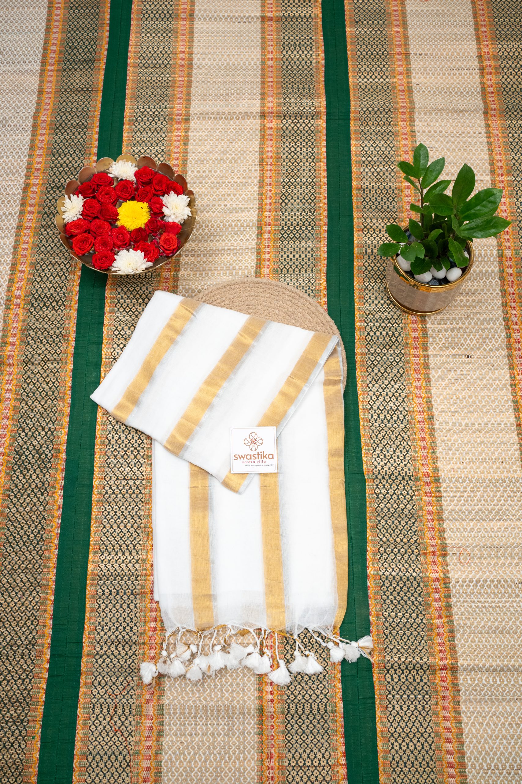 The design features delicate woven stripes across the body, beautifully complemented by a shimmering zari border, creating the perfect harmony of simplicity and festive flair. The high thread count enhances durability and texture, making this saree not just beautiful but long-lasting too.