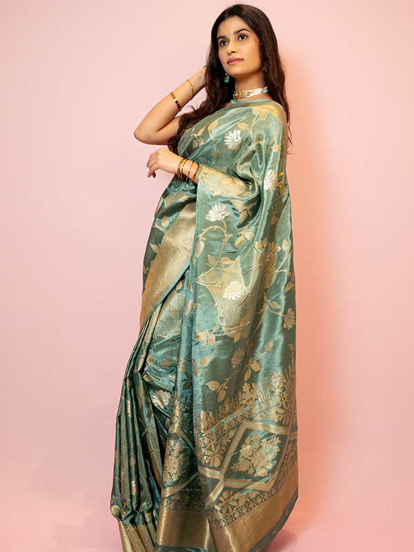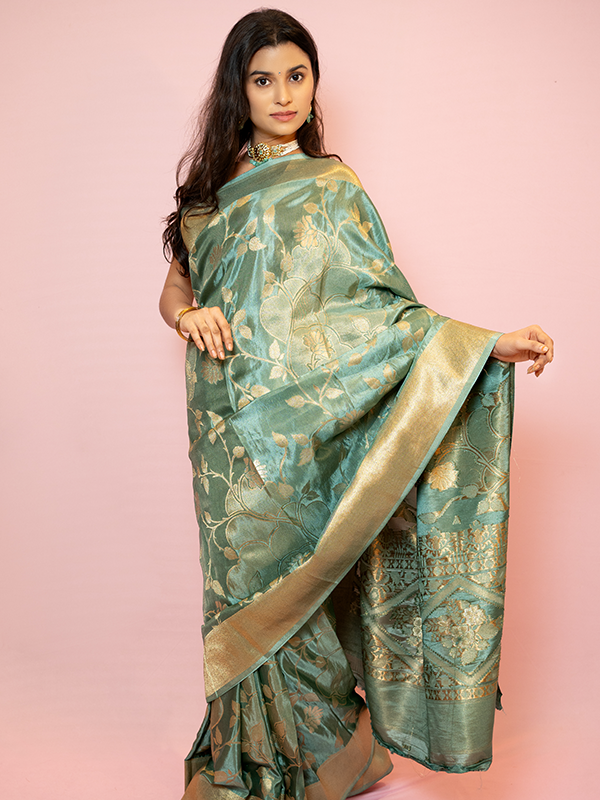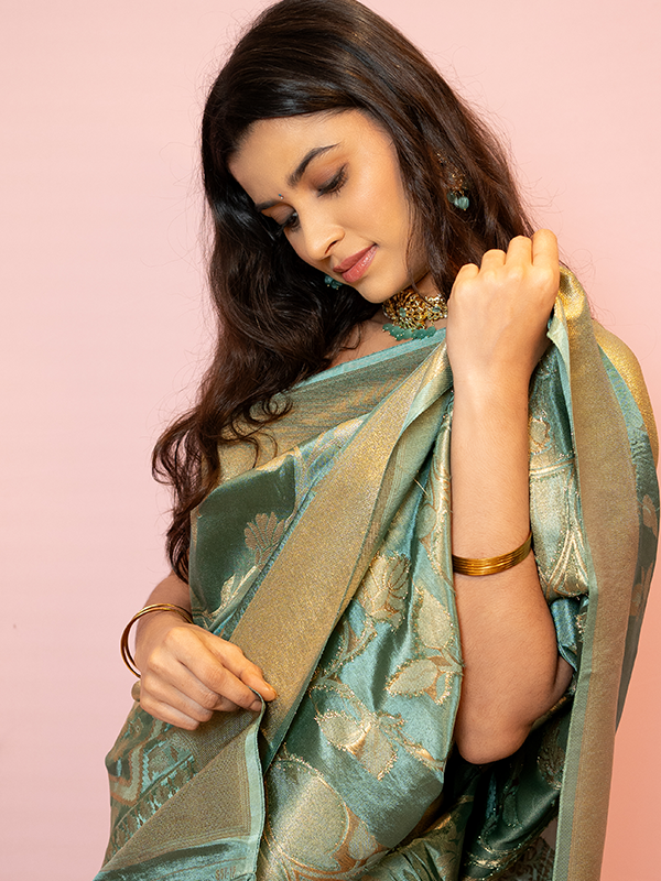 The enchanting teal shade, inspired by the tranquility of nature’s gardens, brings a fresh yet regal touch to the drape. The subtle sheen of Mashru silk enhances its sophistication, while the handwoven texture ensures authenticity and luxury. Each saree is crafted by skilled artisans, continuing the centuries-old Mashru weaving tradition that epitomizes royal elegance.