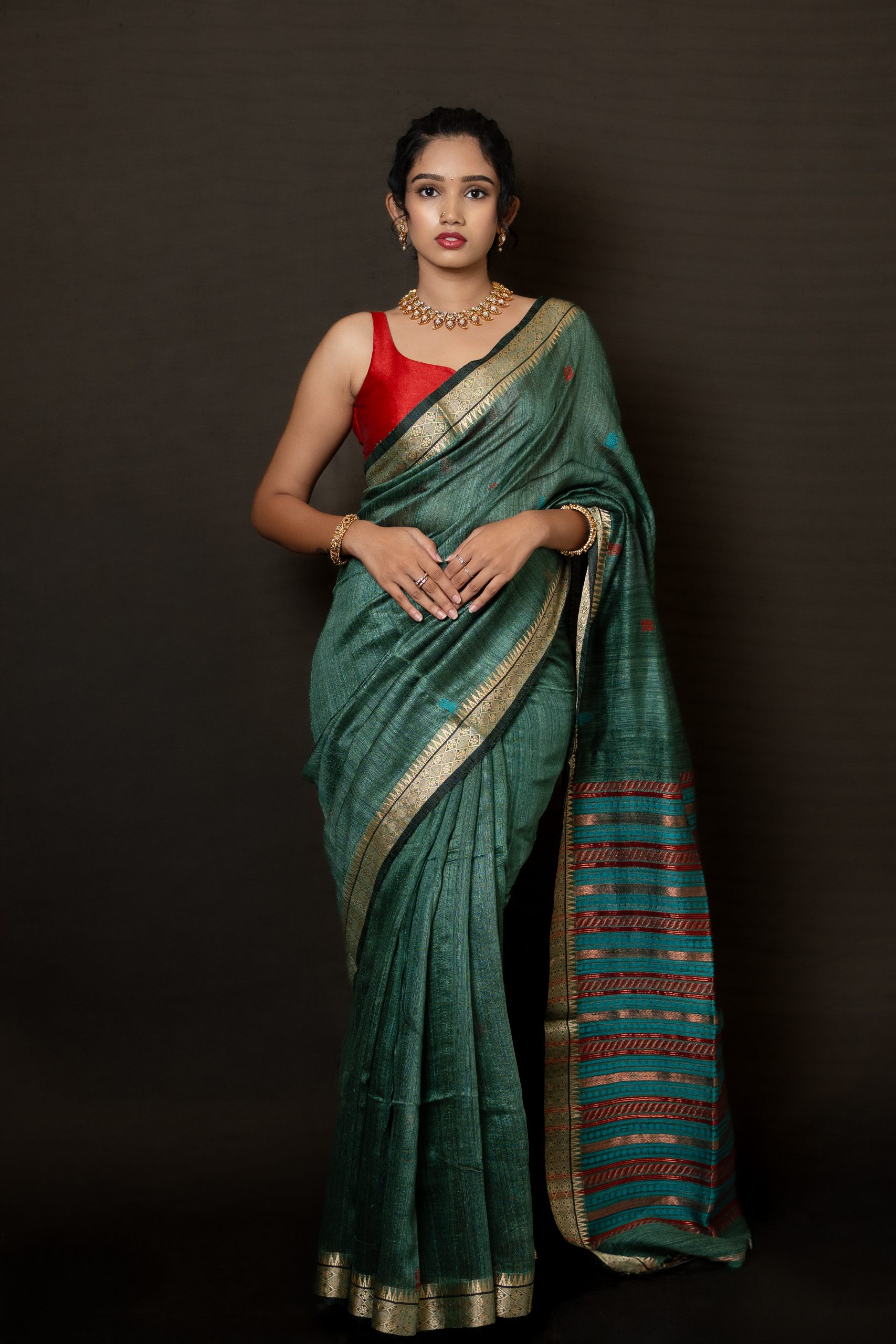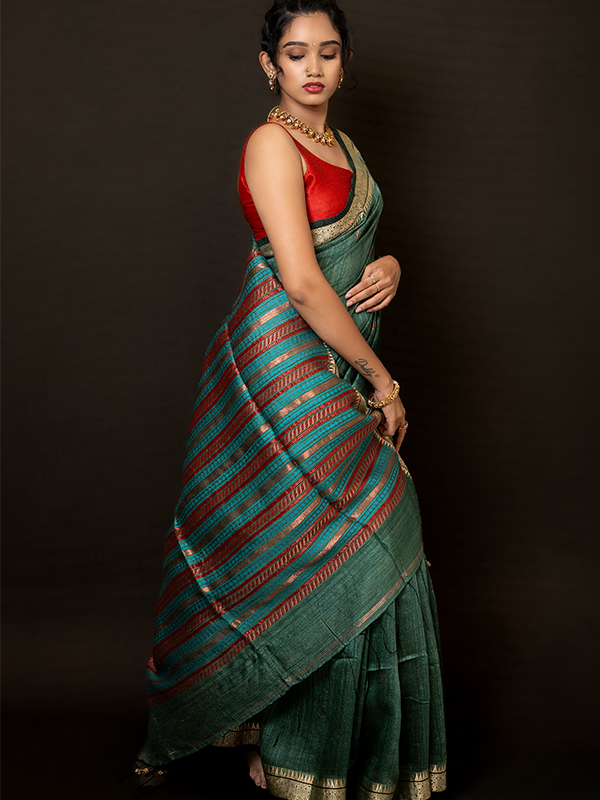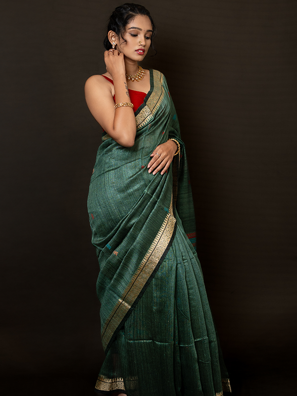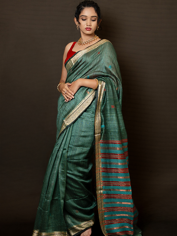 The beautiful teal green hue adds a refreshing and regal charm, while the finely woven contrasting border enhances its traditional appeal. Each saree is handwoven by skilled artisans, preserving the rich legacy of Bengal’s silk craftsmanship.
